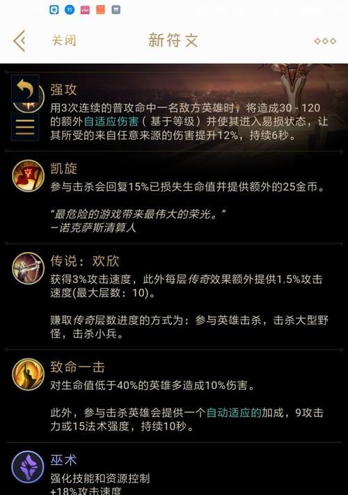 在选择符文时,我们可以选择一些增加攻击力和生存能力的符文,如进攻符文树中的压制、致命节奏和无敌运行,以及防御符文树中的骨甲护盾和生命值提升等。