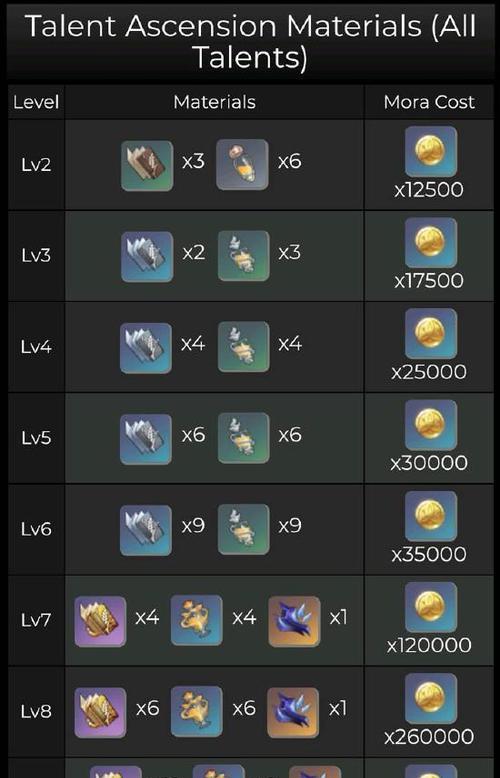 除了等级和突破,天赋的提升也非常重要。要想提高神里绫华的天赋等级,需要消耗大量的元素、角色经验和莫拉。其中,元素是比较难以获取的材料,需要通过完成一些固定活动来获得。
