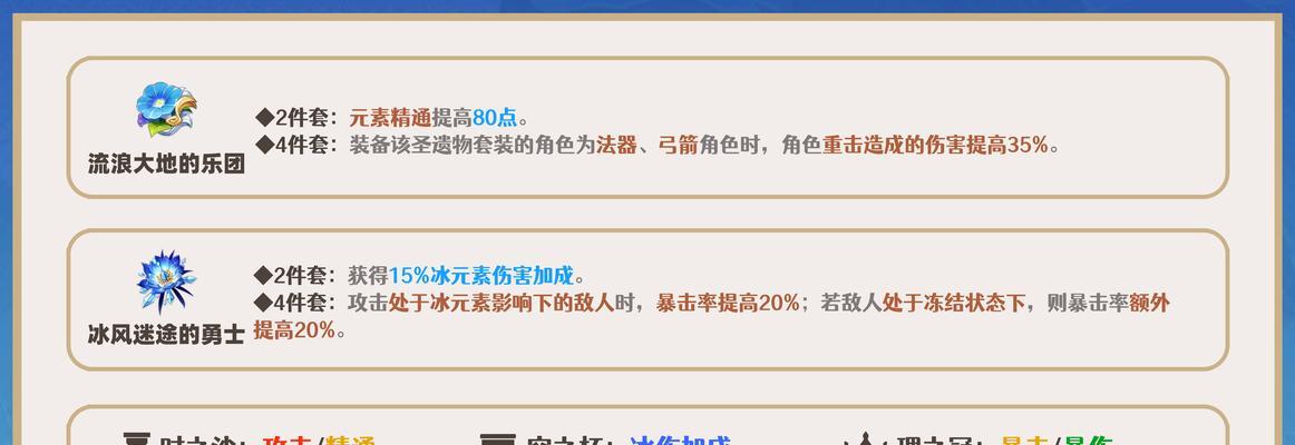 圣遗物的选择也非常重要,不同的圣遗物能够带来不同的属性加成和特殊效果。根据选手属性和技能,可以选择相应的圣遗物,如炎渊战甲、野花记忆、冰风迷途等。