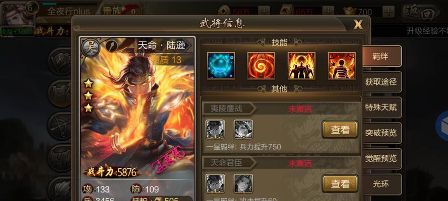 陆逊的天赋技能包括“火计”、“烈火策”和“连环计”,这些技能可以大幅度提升他在战斗中的输出和控制能力。玩家可以根据战斗需求灵活运用这些技能。