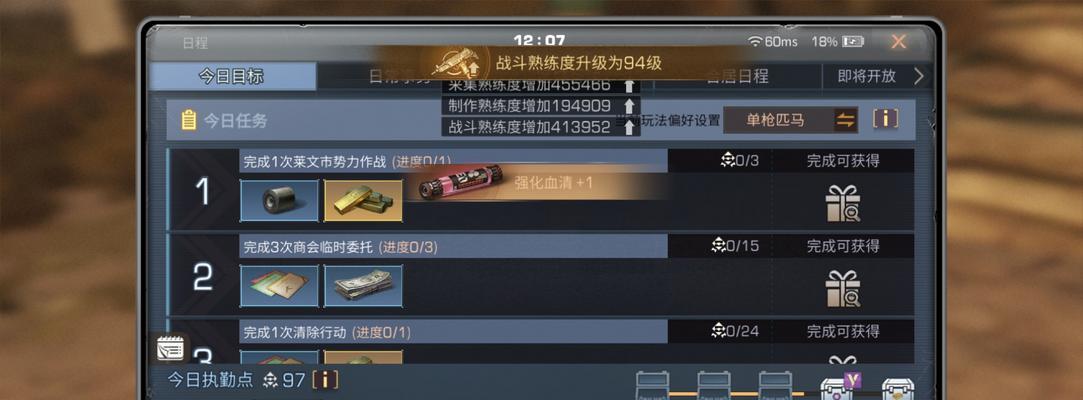 在游戏中,每天都会有一些任务需要完成,完成后可以获得丰厚的奖励。其中,熟练度奖励也是不可少的一部分,玩家需要认真地完成每日任务,才能够获得更多的奖励。
