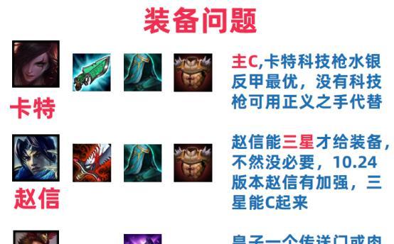 《英雄联盟》中最受欢迎的辅助模式之一,即将迎来全新的版本更新。云顶之弈S5版本中,卡特琳娜阵容成为了一大亮点,成为了许多玩家追逐的目标。本文将为大家介绍云顶之弈S5卡特阵容的装备一览,帮助大家在游戏中轻松获胜。