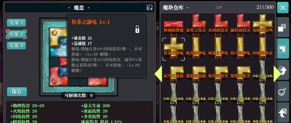 选择符文和宝石是非常重要的,可以大幅提高装备属性。符文选择以增加魔法攻击和法术强度的为主,宝石则以增加攻击力和暴击率为主。
