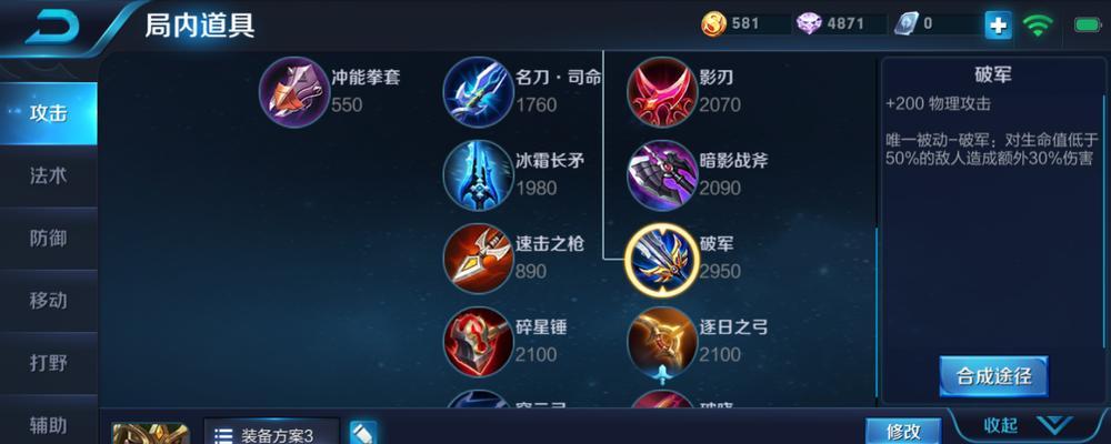 作为一件强力的攻击装备,破军能够为关羽提供大量的物理攻击和暴击伤害,让他在对抗小明时能够轻松击溃对手的防御。