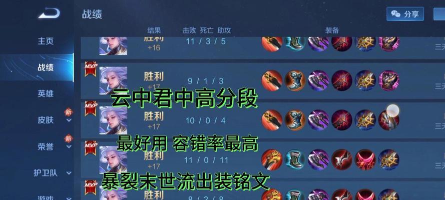 通过本文的介绍,我们详细了解了云中君的出装、符文和技巧。掌握好这些要点,相信每位玩家都能够在游戏中成为战场上的主宰!让我们一起打造无敌的云中君,让敌人闻风丧胆!