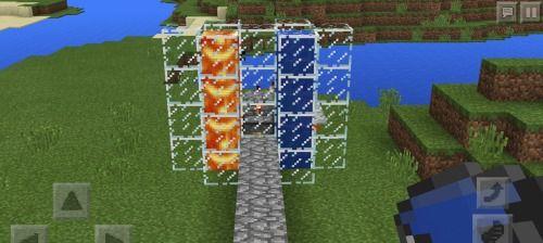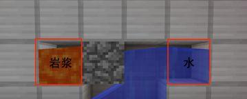 在框架的一端放置一桶水,让水流向另一端。这样,水就会在框架中形成一个循环,为石头生成提供源源不断的动力。在水对面放置一桶岩浆,注意保持一定的距离,以免水和岩浆立即接触生成石头而堵塞。