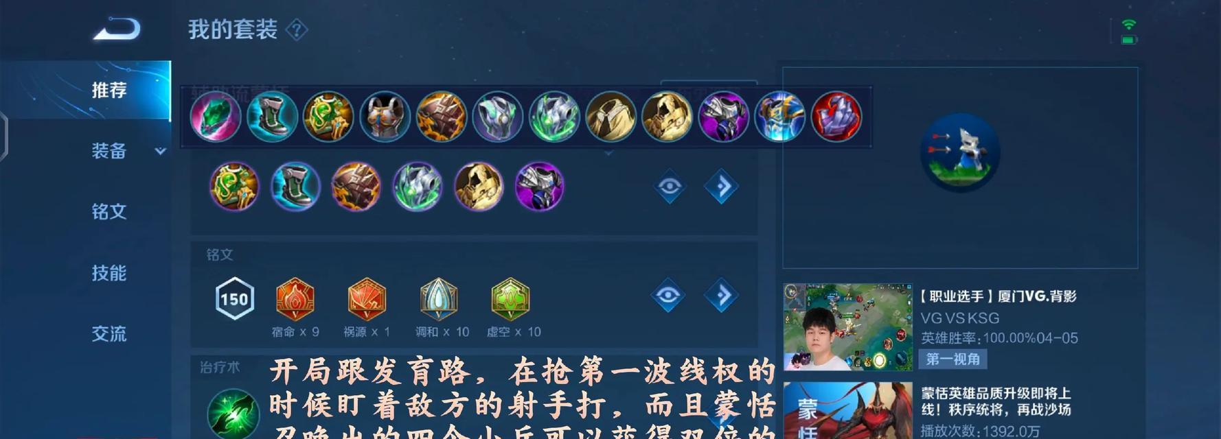 初始装备选择对于蒙恬的发育非常重要。可以选择“草鞋”和“恶魔之谜”,增加蒙恬的生命回复速度和法术防御,提高他的生存能力。