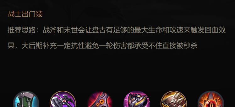 盘古在游戏开局时需要选择合适的开场装备,推荐使用拳套作为起始装备。拳套提供了额外的物理攻击力和生命值,使盘古能够更好地在前期与敌方进行对线,并且还能增加他的生存能力。