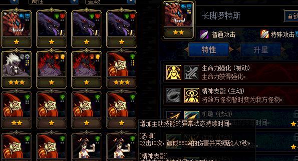 在谋略战中,玩家需要考虑长脚罗特斯的生命值和防御能力,以保证其在战斗中的存活率。在加点时需要适当强化其防御能力,选择加点于技能“吸血鬼”、“狂热”等,可以有效提高其生命恢复和防御能力。