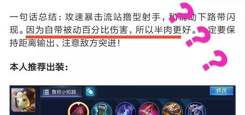 在王者荣耀的游戏中,末日流鲁班作为一个高爆发、高生存力的英雄角色,被越来越多的玩家所钟爱。而在当前版本中,以肉装出装打造一个坚不可摧的末世流鲁班成为了一种新的趋势。本文将详细介绍以肉装出装的末世流鲁班攻略,帮助玩家更好地驾驭这一英雄角色。
