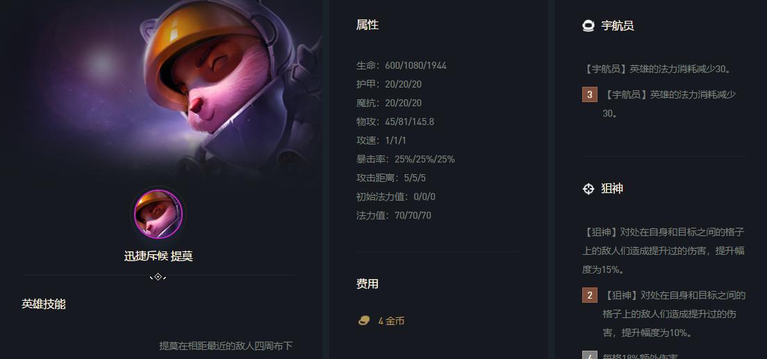 云顶提莫作为一个远程射手英雄,拥有极高的输出能力和优秀的机动性。他在团战中可以通过瞬间爆发的输出击溃敌方核心,并且在敌人围堵时也能通过机动性躲避敌人的技能。合理的出装选择对于发挥云顶提莫的优势至关重要。
