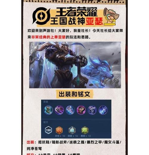作为王者荣耀中的顶尖战士之一,亚瑟一直以来都是玩家们心目中的战斗之王。而随着新版本的推出,亚瑟迎来了一次全面的优化和改进,使他更加强大和全能。本文将详细介绍新版亚瑟的出装攻略,帮助玩家们更好地掌握这位战场之王的力量。