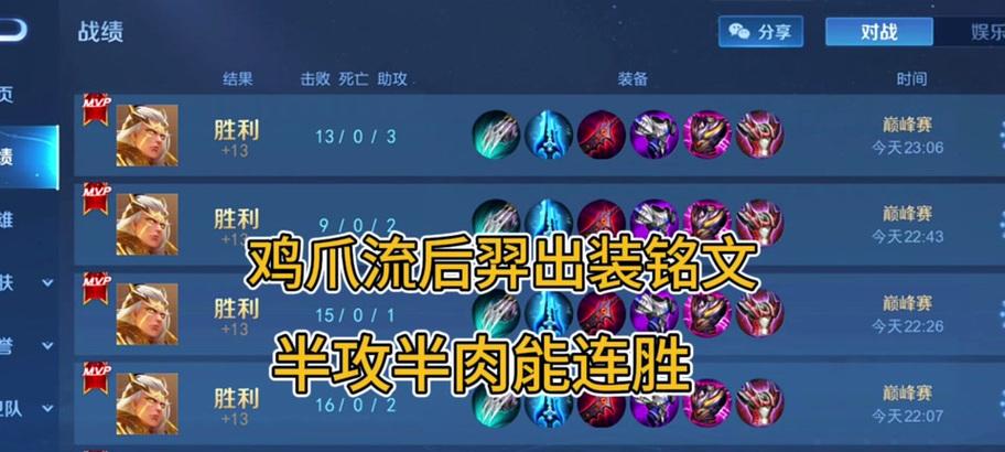 通过选择合适的出装方案,大盗后羿可以充分发挥出其高爆发的输出能力和生存能力。在游戏中,根据敌方的阵容和局势变化,灵活调整出装,才能让后羿真正成为团队中的核心输出。希望本文的出装攻略对您在游戏中的表现有所帮助。