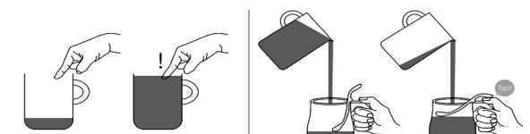 每个杯子的容量是不同的,观察并了解每个杯子的容量,合理安排倾斜和移动的动作,以充分利用水的流动和容量来完成倒水任务。
